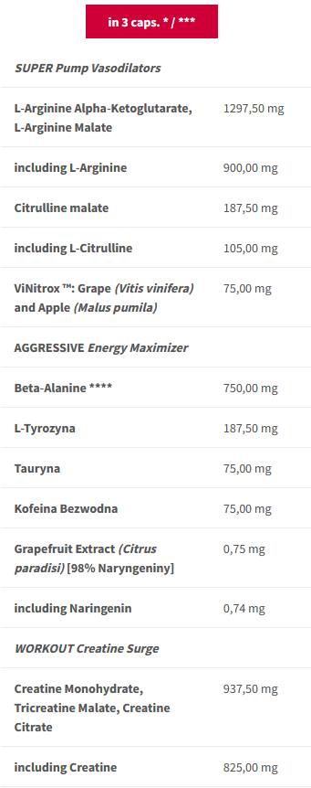 L-аргінін, L-цитрулін, екстракт винограду, екстракт яблука, бета-аланін, L-тирозин, таурин, кофеїн, екстракт грейпфрута, моногідрат креатину, малат креатину, етиловий ефір креатину.