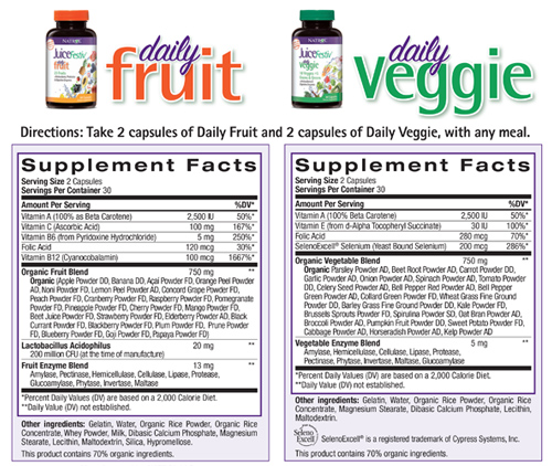 Активний спосіб життя і постійна зайнятість сучасної людини ускладнює приймання повноцінної їжі. Тому нерідко доводиться вдаватися до перекусок. Альтернативним рішенням у щоденному вживанні у своєму раціоні овочів і фруктів є біодобавка Natrol Juicefestiv. У кожній порції продукту міститься необхідна кількість потрібних вітамінів і мінералів, що містяться у фруктах і овочах. Natrol Juicefestiv — це органічна суміш плодів, що містять велику кількість корисних речовин для підтримки здоров'я організму людини.