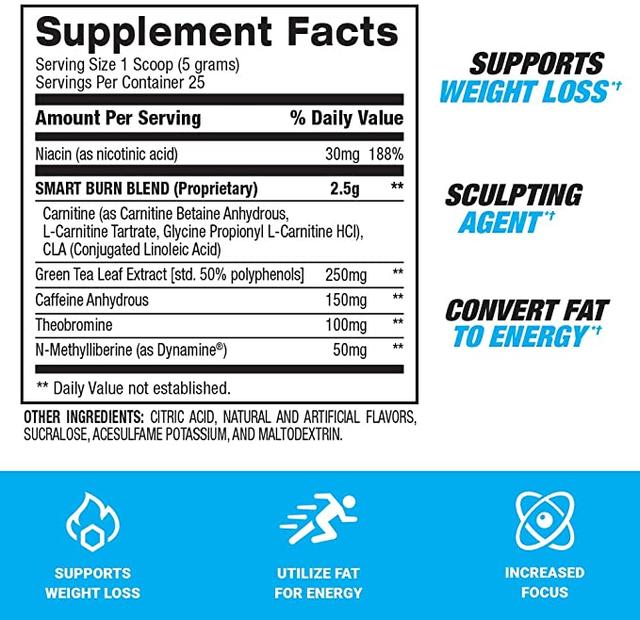 Smart Burn ™ містить запатентований інгредієнт Dynamine ™, який відмінно бадьорить і підвищує настрій без збільшення частоти серцевих скорочень або артеріального тиску.