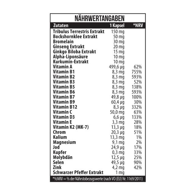 • Трибулус, що входить до складу, природно та безпечно стимулює утворення тестостерону, що позначається на якості тренувань, та на наборі м’язової маси.